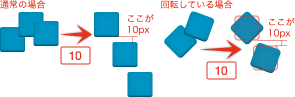 選択しているオブジェクト中で一番下にあるレイヤーを基準に、オブジェクトを入力した数値分の間隔を空けて垂直方向に再配置します。オブジェクトを回転している場合は、回転していない状態と見なして再配置されます(角度を0に戻すと入力した値分の間隔が空いている)。水平方向は変化しません。