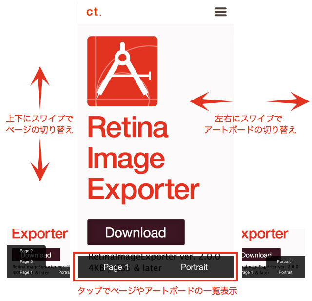 左右スワイプでアートボードの変更、上下のスワイプでページの変更になります。タップすると下にメニューが出てきて、左側がページの切り替え、右側がアートボードの切り替えとなっています。