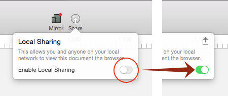 ツールバーの「Share」をクリックし、「Enable Local Sharing」のトグルスイッチを切り替えます。「Enable」にすると、デフォルトブラウザが立ち上がり、アートボードとページの一覧が表示されますので、確認したいアートボードを選択してください。また、[File → Local Sharing]でも同様のことが可能です。