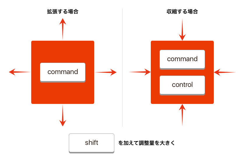 ややこしいですが、Command + 伸ばす方向のキーを基本に、縮める時はControlを押して縮める方向のキー、さらに大きく調整する時はShiftを押す、と覚えましょう。