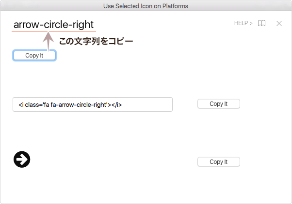選択しているアイコンフォントの文字名・HTMLコード、文字コードの情報およびコピーボタンが表示されます。ショートカットはCommand + Control + Uです。