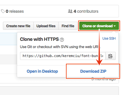 右上の「Clone or Download」ボタンからポップアップを表示し、「ZIP Download」をクリックすると「font-bundle-master」というZIPファイルのダウンロードが始まります。
