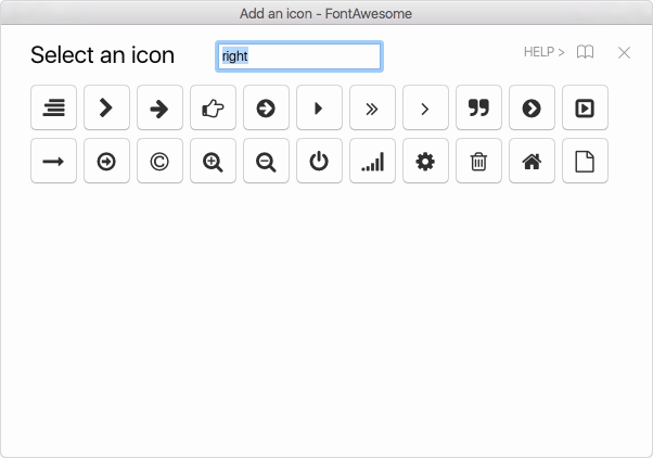 文字に応じた名前を入力し、アイコンフォントを挿入します。ただし、名前が完全に一致する必要があります。ショートカットはCommand + Control + Iです。