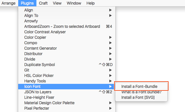 まずはプラグインをインストールし、「Plugins → Icon Font → What is a Font Bundle?」を選択しウィンドウを表示します。
